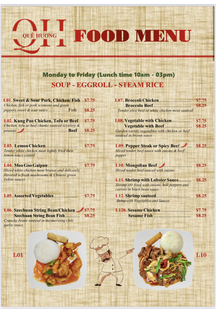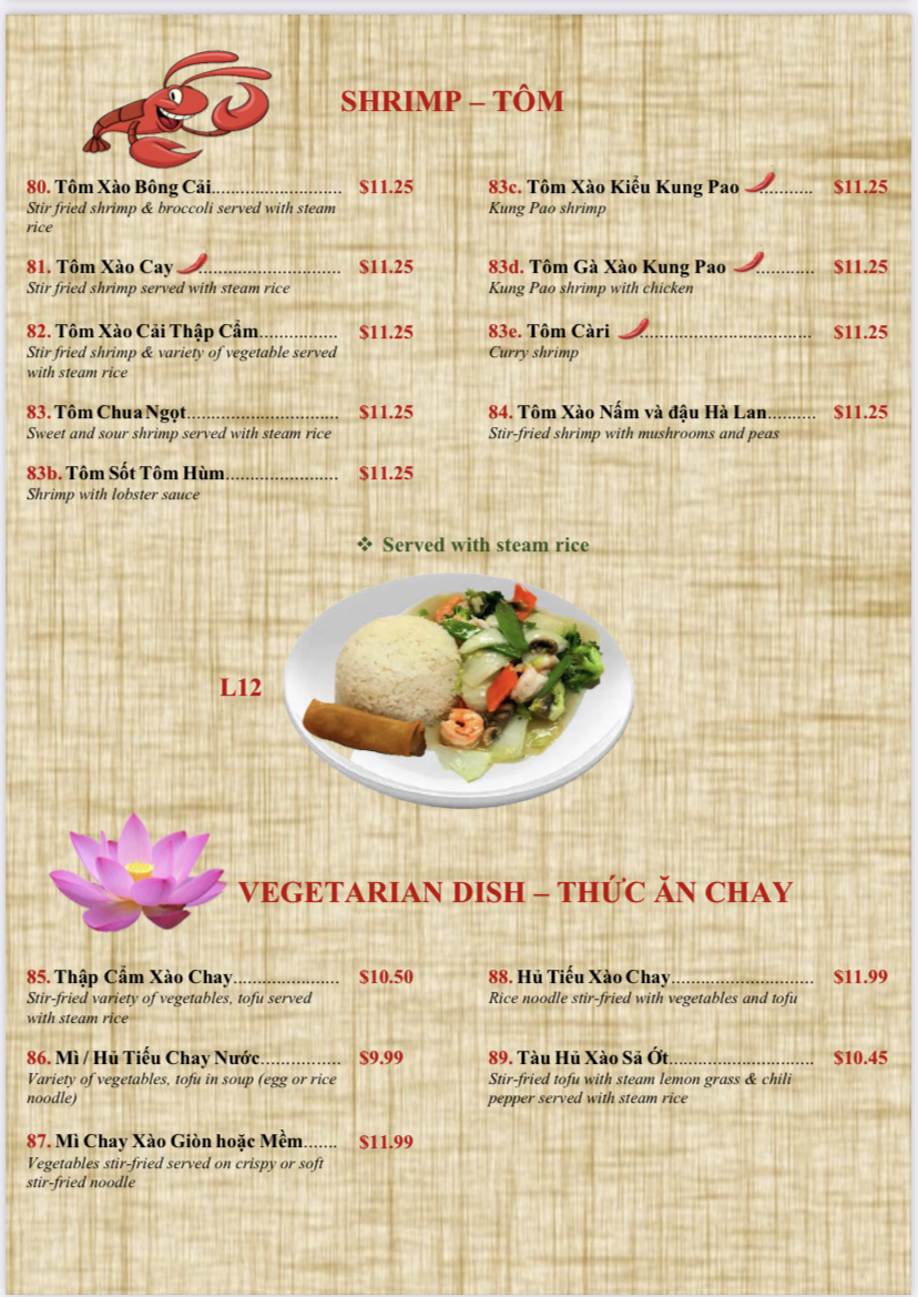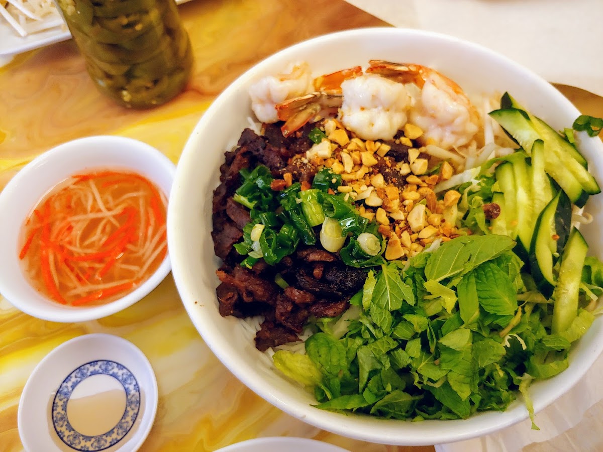 Que Huong specializes in an array of traditional Vietnamese dishes that are guaranteed to satisfy your taste buds. Start your meal with Cha Gio (crispy egg rolls), served fresh and hot at just US$2.75 for two. The satisfying crunch paired with the delicate fillings truly exemplifies Vietnamese street food culture. For a heartier option, don’t miss the Bun Tom Xao Cu Hanh, a vibrant vermicelli noodle dish with stir-fried shrimp and vegetables for US$6.95. Each bite bursts with flavor, providing a refreshing contrast to the other richly seasoned dishes on the menu.